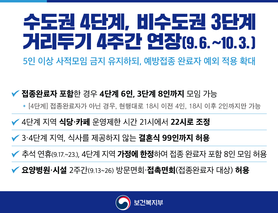 - 추석 연휴기간(9.17∼9.23) 4단계 지역의 가정 내 가족 모임은 접종 완료자 포함 8인까지 허용 -