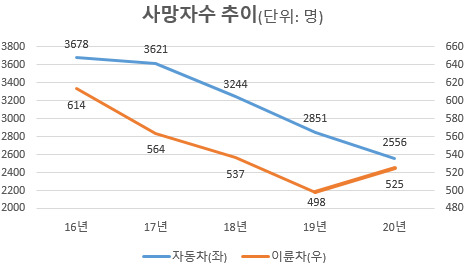 ㅇ 특히, 이륜차 사망자 수는 전체 교통사고 사망자의 1/6(525/3,081명, ‘20년 기준) 수준이며, 사고건수 대비 사망률과 1만대당 사망자 수도 자동차에 비해 매우 높아* 안전 확보를 위한 노력이 시급한 실정이다.