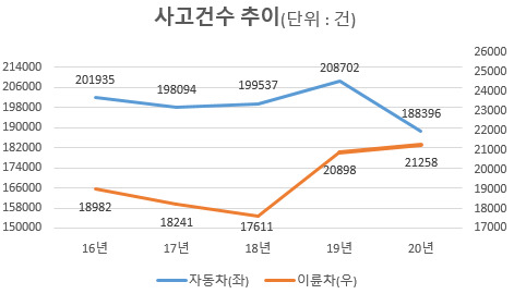 ㅇ 그러나 최근 자동차 사고건수 및 사망자 수가 감소하는 반면, 코로나 19로 인해 이륜차 배달대행 서비스가 활성화 됨에 따라, 이륜차 사고건수와 사망자 수는 오히려 증가*하는 추세이다.