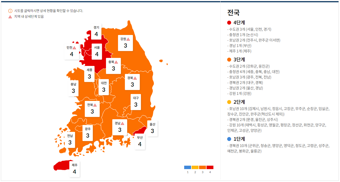 | 행사 | ▪500인 이상 행사 시 지자체 사전 신고 | ▪100인 이상 행사 금지 | ▪50인 이상 행사 금지 | ▪행사 금지 | ||||||