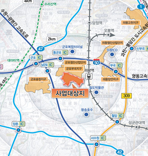 ㅇ (교통여건) 지구 동측(약 1㎞)에 지하철 1호선 의왕역이 위치하여 수도권 이동이 편리하고 수원-광명 간 고속도로, 영동고속도로와 국도42호선·국도47호선이 인근에 위치해 있다.