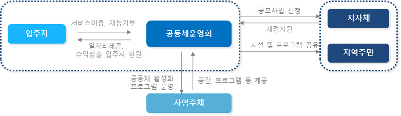 입주민공동체 등이 참여하는 주거서비스 관련 수익사업 추진, 입주민 이용비용 경감, 일자리 제공  경제적 이익을 창출하는 운영계획 수립