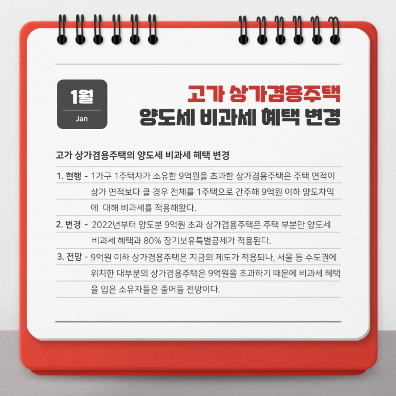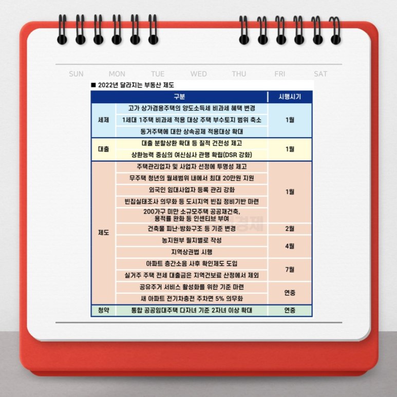 일상생활 (EveryDay) 2022년 부동산 제도 어떤게 바뀔까? by 날으는물고기 2021. 12. 20. 2022년 부동산 제도 어떤게 바뀔까? 728x90 2022년도 부터는 어떤 부동산 제도가 바뀔까? 고가 상가겸용주택 양도세 비과세 혜택 변경 1세대 1주택 비과세 적용대상 주택 부수토지 범위 축소 동거주택 상곡공제 적용 대상 확대 대출 분할 상환 확대 등 질적 건전성 제고 제2금융권 관리강화 및 DSR 규제 조기 시행 주택관리업자 및 사업자 선정에 투명성 제고 외국인 임대사업자 등록 관리 강화 무주택 청년에게 월세 최대 20만원 지원 빈집실태조사 의무화 등 도시지역 빈집 정비기반 마련 200가구 미만 소규모주택 공공재건축, 용적률 완화 등 인센티브 부여 조합원 입주권 양도소득세 비과세 개정 건축물 피난,방화구조 기준 변경 농지 원부 필지별로 작성 아파트 층간소음 사후 확인제도 도입 실거주 주택 전세대출금 지역 건보료 산정에서 제외 공유주거 서비스 활성화, 건축기준도 알기 쉽게 개선 새 아파트 전기차 충전 주차면 5% 의무화 통합 공공임대주택 다자녀 기준 변경, 3자녀 --> 2자녀 2022년 달라지는 부동산 제도 출처 : 인터넷 728x90 그리드형(광고전용) 공유하기 게시글 관리 pages.kr 날으는물고기 <º)))>< 저작자표시 비영리 변경금지 (새창열림) 관련글 모든 피자 온라인 포장 50% 할인 전세형 임대주택 6천호, 전국 입주자 모집 실시 내일부터 사적모임 4인까지, ‘긴급 멈춤’ 시작 청소년(12-17세) 학교단위 코로나19 예방접종 댓글