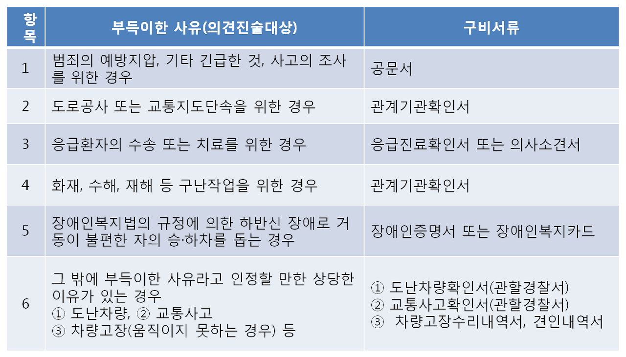 - 기타 다른 차량 또는 보행자의 교통에 위험하거나 방해될 염려가 있는 경우