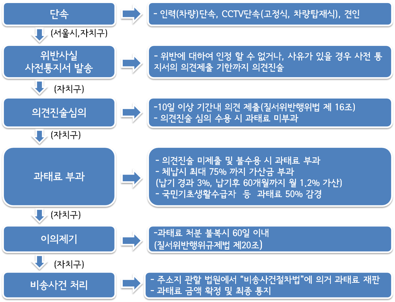- 의견진술 : 과태료부과 사전통지서를 받고 의견이 있을 경우에는 해당 자치구에 10일이상의 기간을 정하여 의견을 제출 할 수 있는 기회가 있습니다.