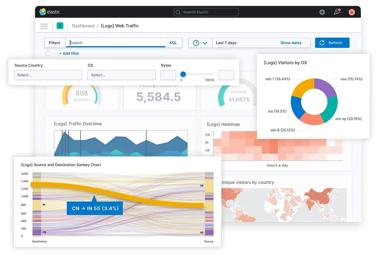 - ELK (Elasticsearch, Logstash, Kibana): 로그 관리 및 분석을 위한 도구로, 로그 데이터를 수집, 색인, 시각화 및 분석합니다. 서버, 방화벽 및 침입 탐지 시스템과 같은 다양한 소스에서 로그 데이터를 활용하여 보안 사건을 탐지하고 대응할 수 있습니다.