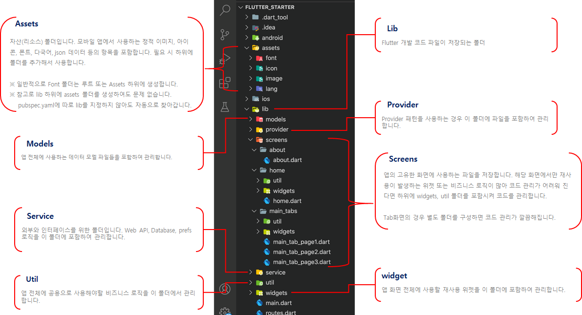이 폴더 구조는 다양한 Flutter 프로젝트에서 일반적으로 사용되는 구성 요소를 포함합니다. 모델, 서비스, 프로바이더, 화면, 유틸리티 및 위젯과 같은 요소들을 별도의 폴더로 구분하여 코드를 체계적으로 관리할 수 있도록 합니다. 또한 앱 자원을 관리하는 assets 폴더도 포함되어 있습니다.