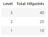 SELECT Level, SUM(Hitpoints) AS `Total Hitpoints`