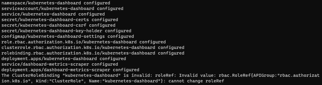 The ClusterRoleBinding "kubernetes-dashboard" is invalid: roleRef: Invalid value: rbac.RoleRef{APIGroup:"rbac.authorization.k8s.io", Kind:"ClusterRole", Name:"kubernetes-dashboard"}: cannot change roleRef