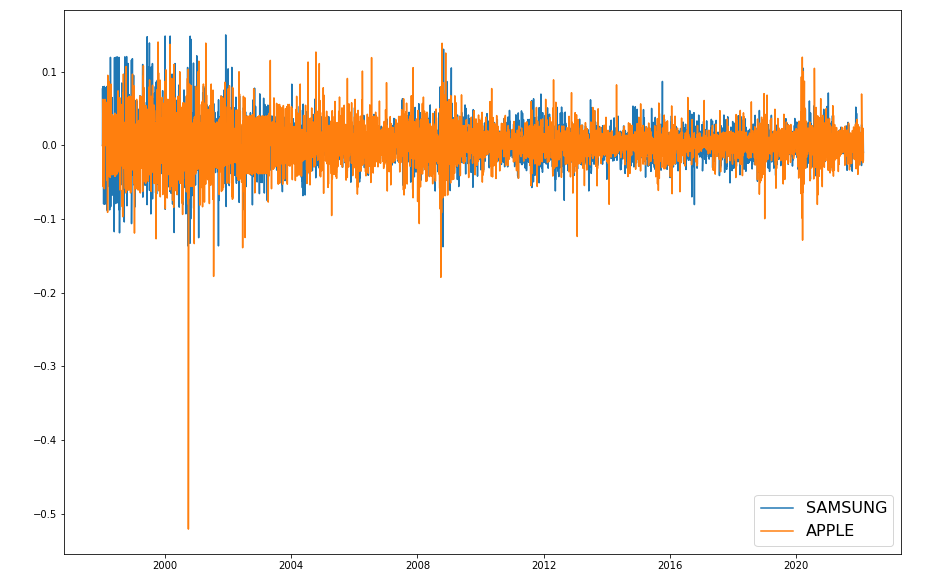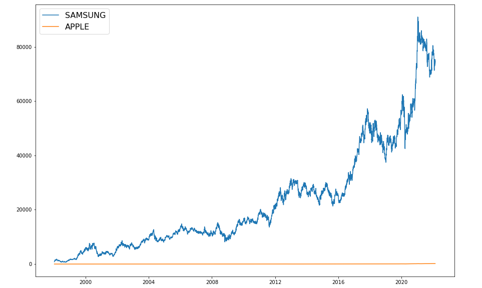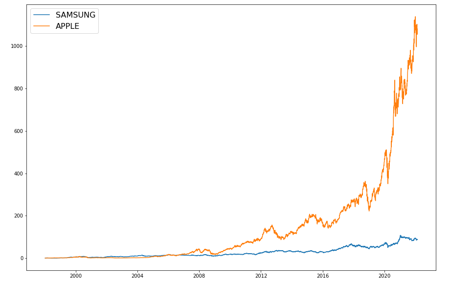 plt.figure(figsize=(15, 10)): 그래프의 크기를 가로 15인치, 세로 10인치로 설정합니다. 그래프의 크기는 화면에 어떻게 표시될지를 제어합니다.plt.plot(samsung["Close"], label="SAMSUNG"): 삼성 주가 데이터의 종가를 그래프로 표시하며, 레이블(legend)은 "SAMSUNG"으로 설정합니다.plt.plot(apple["Close"], label="APPLE"): 애플 주가 데이터의 종가를 그래프로 표시하며, 레이블(legend)은 "APPLE"로 설정합니다.plt.legend(fontsize=16): 레전드(설명)를 추가하고, 폰트 크기를 16픽셀로 설정합니다.plt.show(): 그래프를 화면에 출력합니다.