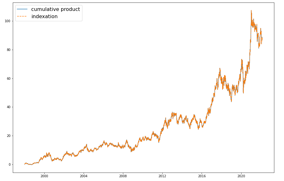 두 그래프를 비교하면 거의 일치하는 것을 확인할 수 있습니다. 누적곱 및 지수화는 상대적인 성과 및 변동성을 파악하는 데 유용한 방법 중 하나입니다.