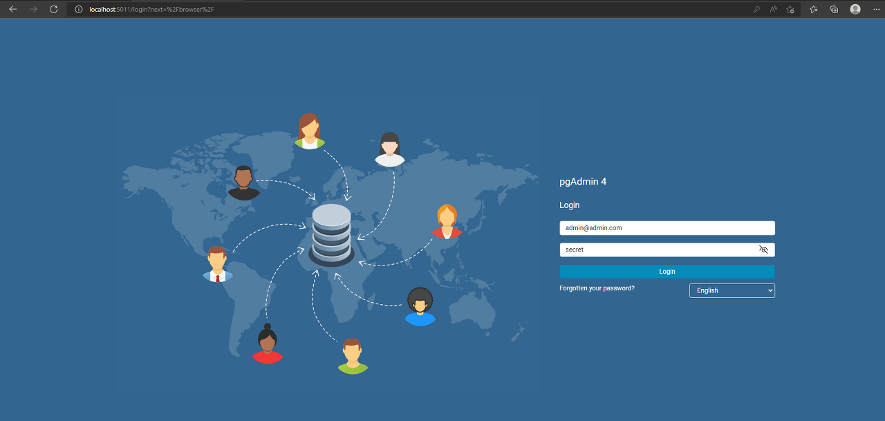 - pgAdmin 클라이언트는 브라우저에서 http://localhost:5011/login 주소로 접근할 수 있으며, 로그인 정보는 admin@admin.com 및 secret입니다.