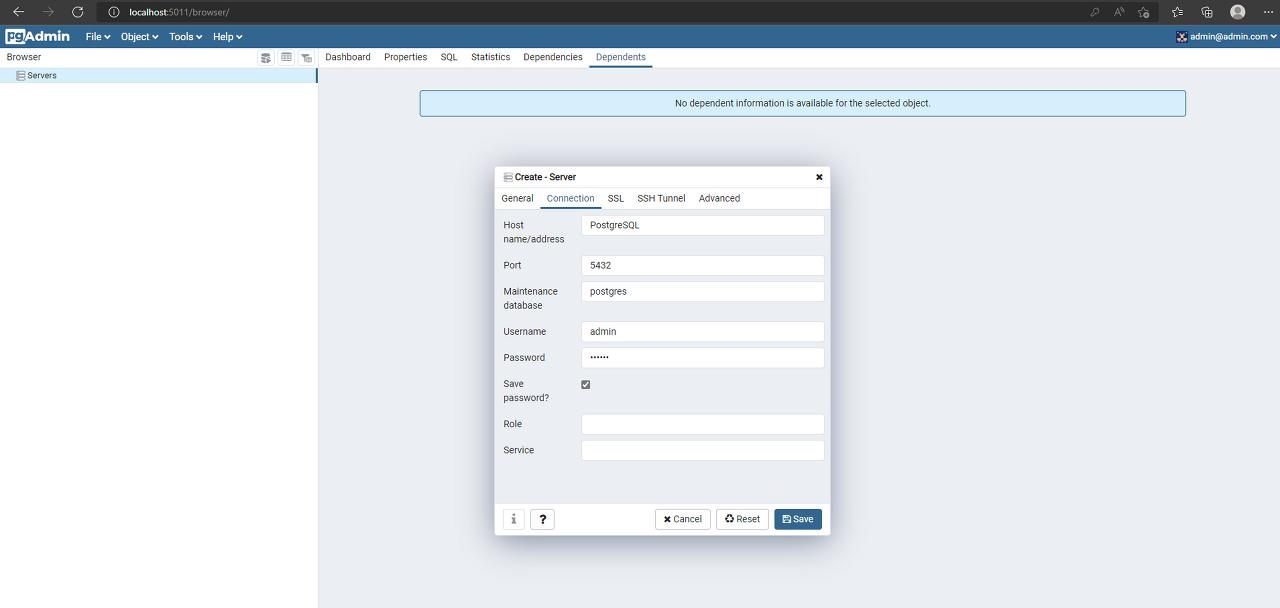 - 호스트 이름 또는 서버: PostgreSQL (이것은 Docker 컨테이너의 이름입니다)