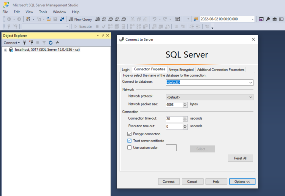 - "TrustServerCertificate = True"로 설정해야 할 수 있습니다. (https://stackoverflow.com/a/50504551/2948523)