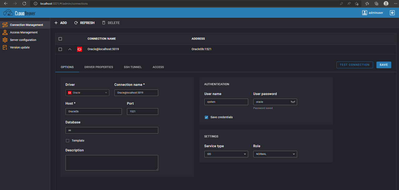 이제 Oracle 데이터베이스와 CloudBeaver GUI 클라이언트가 도커 컨테이너로 실행됩니다. 이제 이들에 액세스하려면 다음과 같이 할 수 있습니다: