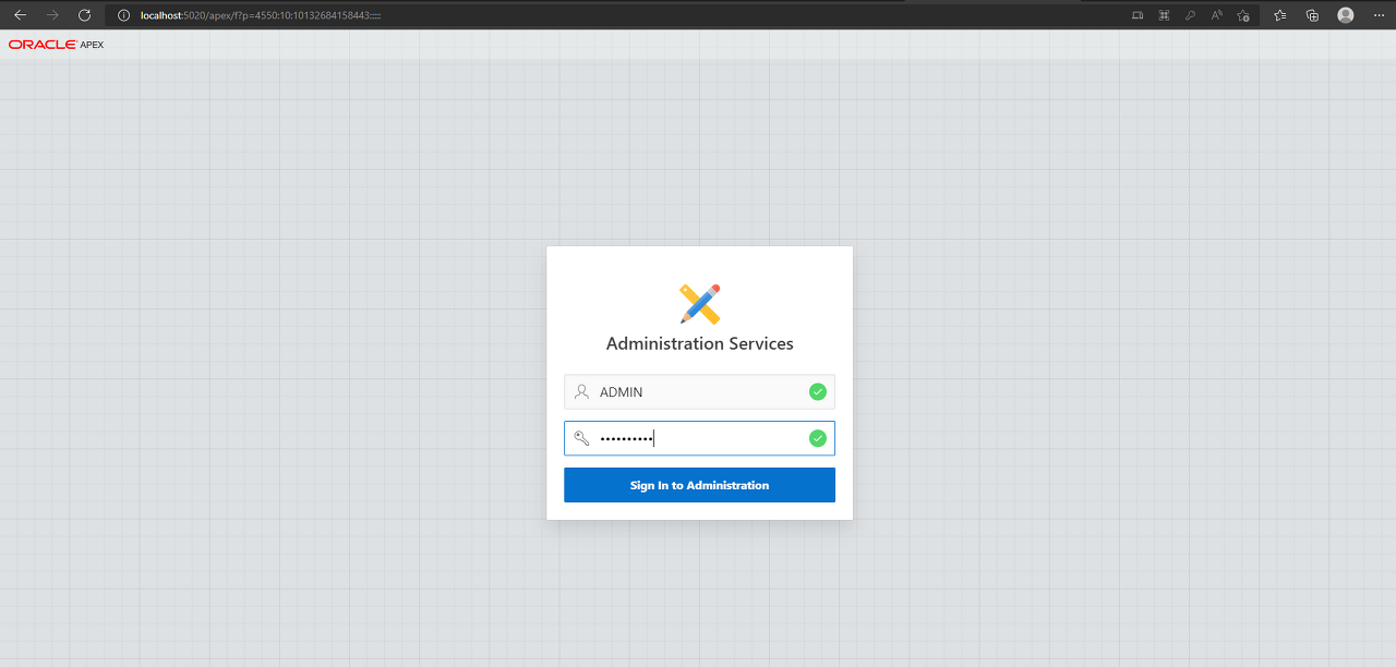 - Oracle APEX 관리자 페이지는 http://localhost:5020/apex/apex_admin 주소로 접근할 수 있으며, 로그인 정보는 다음과 같습니다: