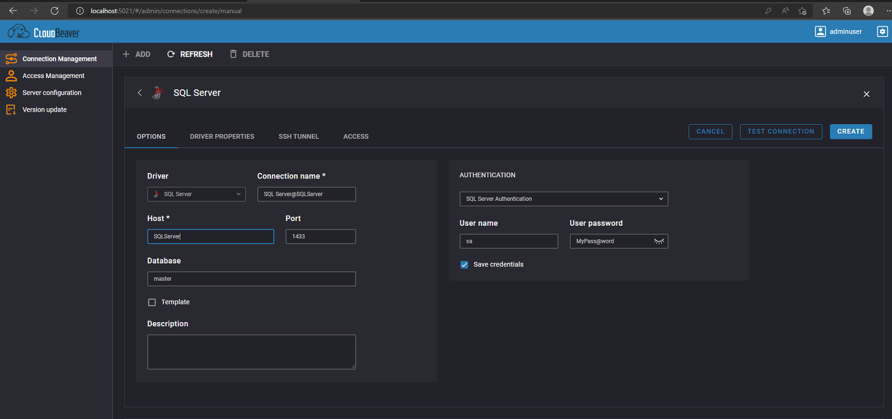- CloudBeaver 클라이언트는 브라우저에서 http://localhost:5021/ 주소로 접근할 수 있으며, 초기 자격 증명을 설정하라는 메시지가 표시됩니다. 여기서 사용자 이름은 "adminuser"이고 비밀번호는 "adminpass"로 설정했습니다.