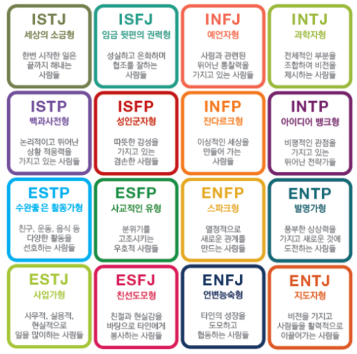 | 인식 (Perceiving) | 판단 (Judging) | 생활 양식: 즉흥적인 생활 / 계획적인 생활 |
