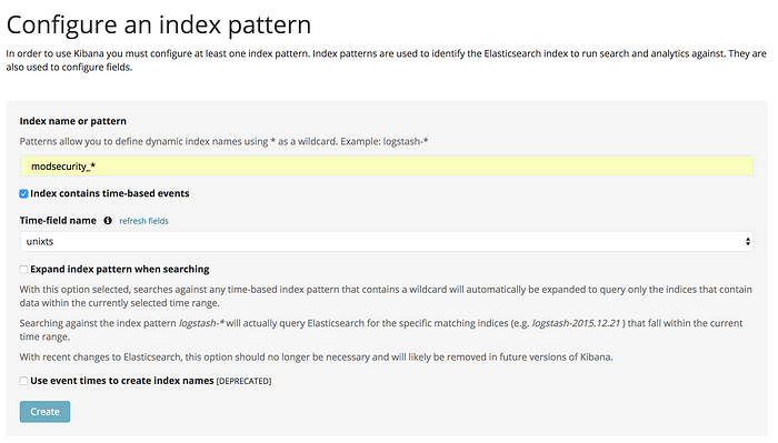 "Time Filter field name"에서 "unixts"를 선택하고 "Create index pattern"을 클릭합니다.