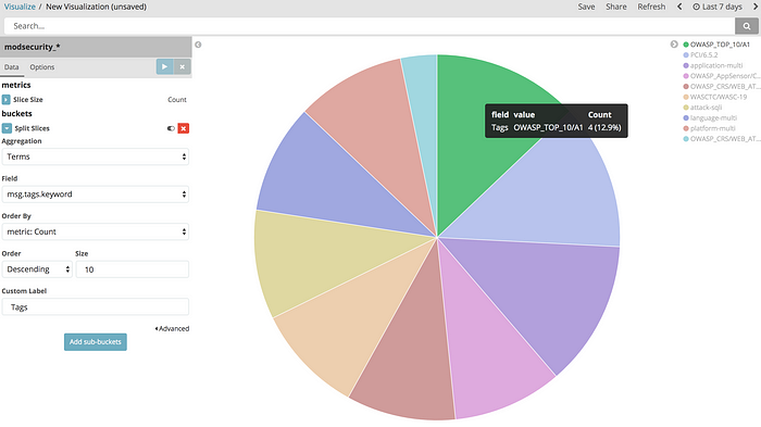 "Pie chart"를 선택하고 "msg.tags" 필드를 사용하여 파이 차트를 생성합니다.
