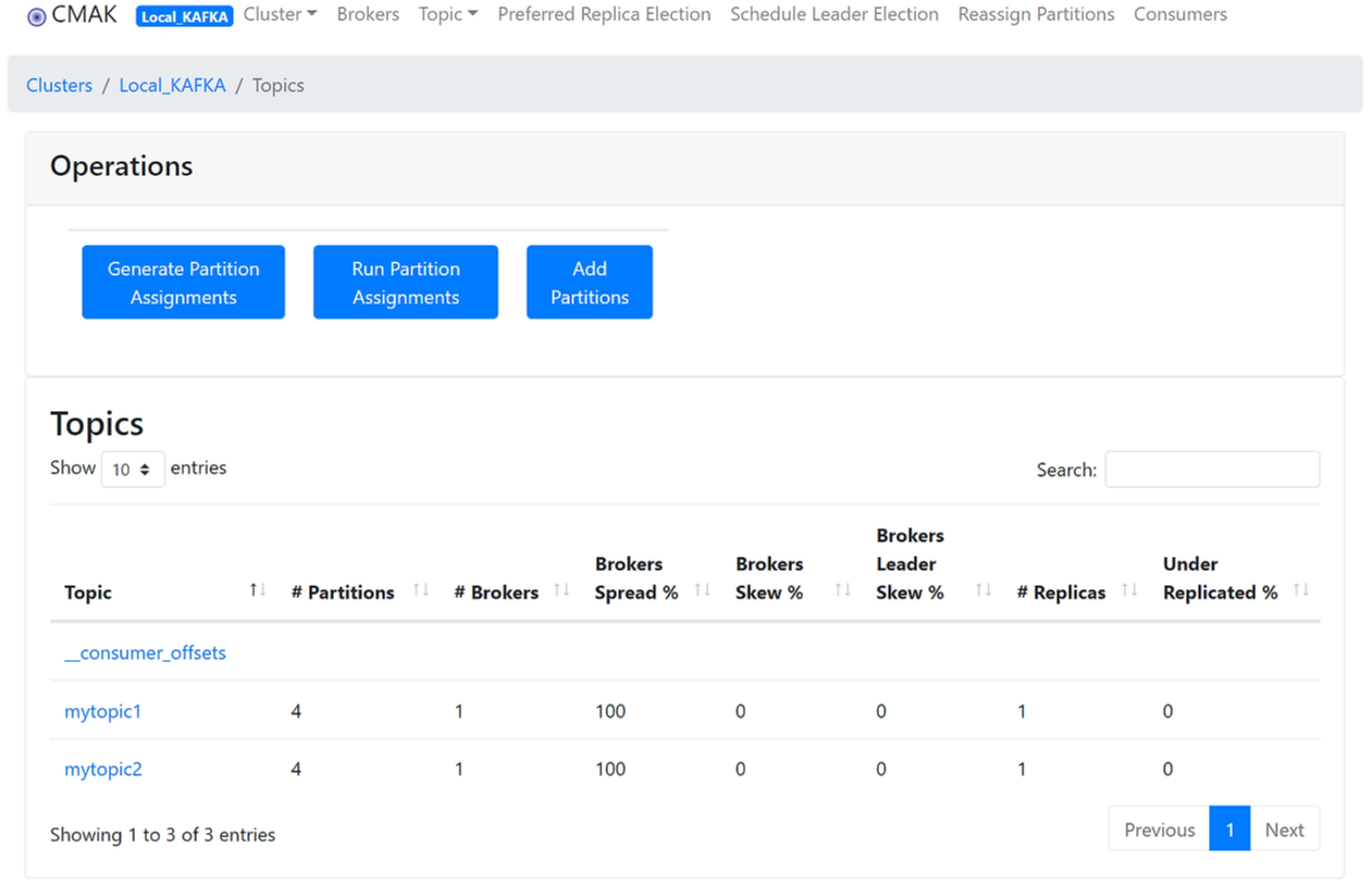 Kafka 명령어를 사용하여 클러스터 및 토픽에 대한 기본 정보를 확인할 수 있습니다.# Kafka 클러스터 목록 확인 kafka-topics.sh --zookeeper <ZOOKEEPER_SERVERS> --list # 특정 토픽에 대한 정보 확인 kafka-topics.sh --zookeeper <ZOOKEEPER_SERVERS> --describe --topic <TOPIC_NAME> - Kafka Manager 사용