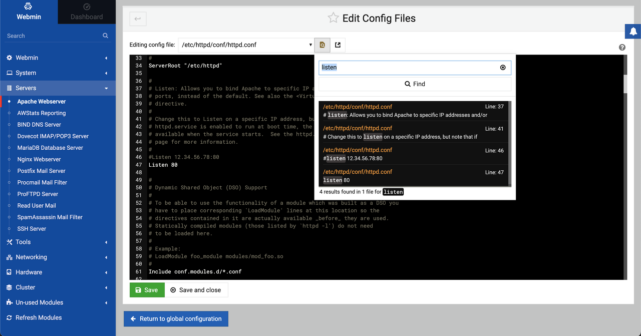 - Webmin의 보안 설정을 강화하려면 "Webmin" 섹션에서 "Webmin Configuration"으로 이동합니다.