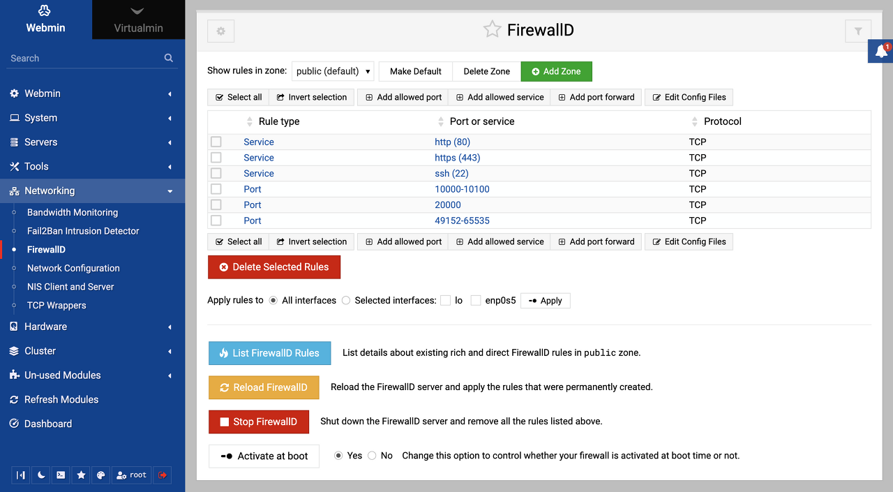 Webmin을 사용하여 FirewallD 규칙을 관리하는 방법은 다음과 같습니다.