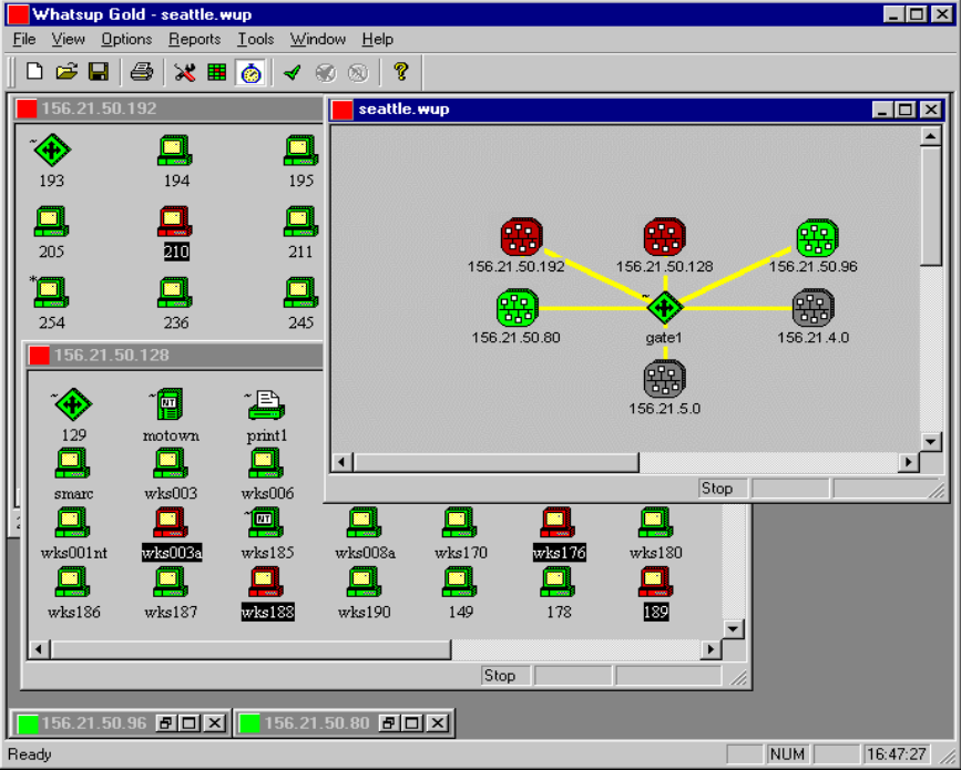 http://www.ipswitch.com/Products/WhatsUp/index.html나 http://solvnt1.solvithightech.co.kr/ipswitch/WhatsUp/ 에서 다운로드하여 실행하면 사용 가능하며 지정된 서버나 네트워크가 접속되지 않거나 특정 서비스(sendmail, http등)가 작동하지 않을 경우에는 그림과 같이 해당 아이콘의 색이 변하면서 사운드 알람 , 비퍼, 페이저, 이메일, 음성 메시지로 해당 시스템이나 네트워크가 다운되었음을 통지하게 된다. 또한 로그 파일에 관련 정보를 저장하여 차후에 각종 통계를 위한 기능으로 사용할 수도 있다. 실제로 필자가 테스트해 보았을 경우에는 시스템이 다운 후 몇 초만에 다운 여부를 알려주었다. 이 프로그램의 한 가지 단점이라면 리눅스가 아닌 원도우에서 작동하는 프로그램이라는 점이며 이와 비슷한 프로그램으로 리눅스에서 작동하는 프로그램을 원한다면