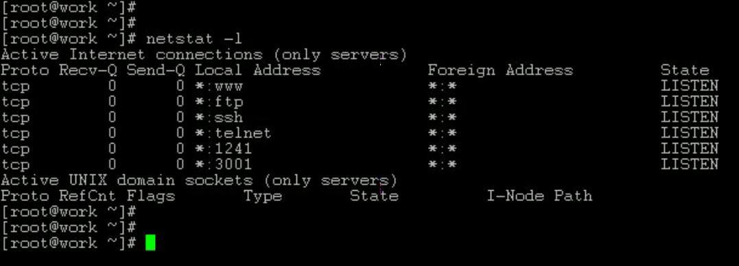 시스템 모니터링을 위해 가장 막강하면서도 간단한 프로그램으로는 앞에서 잠깐 설명한 netstat 이 있다. netstat 은 네트워크 연결정보, 라우팅 테이블, 인터페이스 정보등을 제공하며 그림과 같이 netstat –l 을 입력시 현재 시스템에서 리슨(Listen) 하고 있는 프로그램 및 포트 정보를 알려준다.