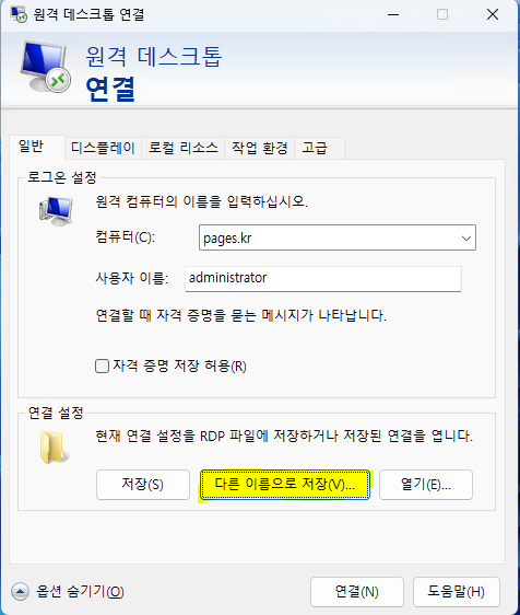 - 원격 데스크톱 연결을 시작하고, 연결할 컴퓨터의 정보를 입력한 후 "저장"을 클릭하여 RDP 파일을 저장합니다.