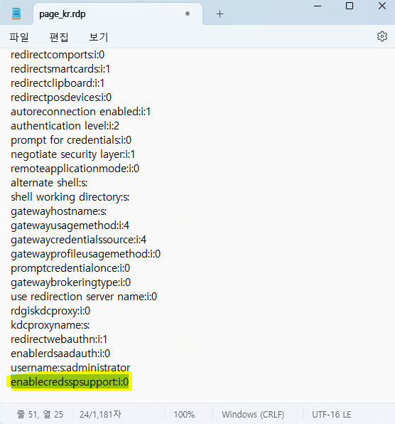 # enablecredsspsupport 옵션 추가