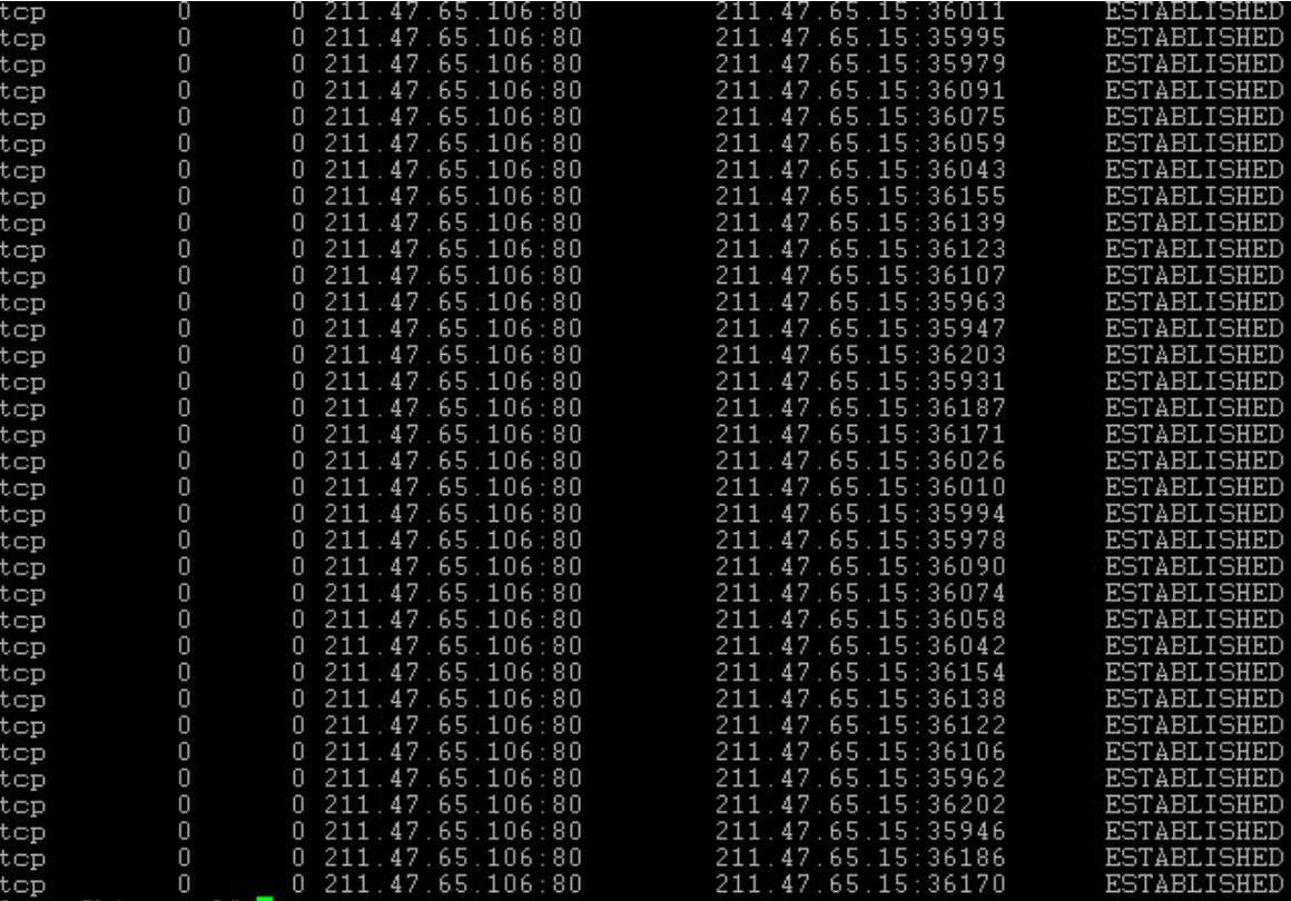 또한 SYN 패킷 요청만 보내는 서비스 거부 공격의 일종인 TCP SYN Flooding 공격(본지7월호 SysAdmin 내 “TCP SYN Flooding 공격의 원인과 해결책” 참고) 이나 아래와 같이 특정 데몬의 접속 요청을 독점해 버리는 Connect Flooding 공격도 감지 (netstat –na|grep EST) 할 수 있다.