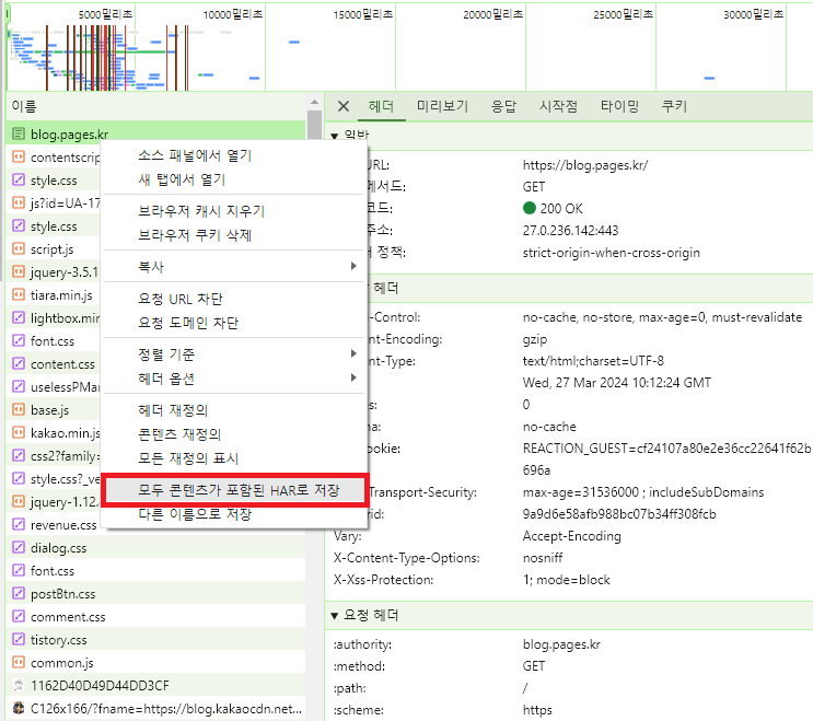 - response: 개별 HTTP 응답에 대한 정보를 포함합니다. 상태 코드, 헤더, 쿠키, 응답 바디의 크기와 내용 등이 포함됩니다.