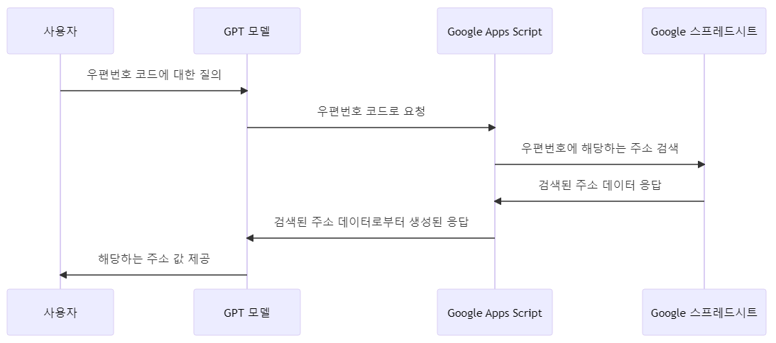 - 질의 처리: 사용자가 GPTs에 우편번호를 기반으로 질의하면, GPT 모델은 설정된 Custom Actions를 통해 Apps Script에 우편번호를 전달합니다.