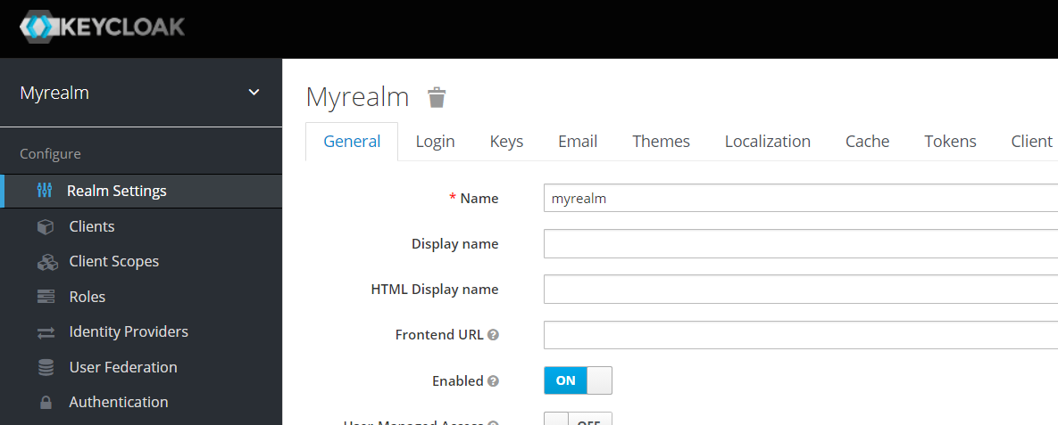 - 새로운 Realm 생성: Keycloak 관리 포털에서 'myrealm'과 같은 새로운 realm을 생성합니다.