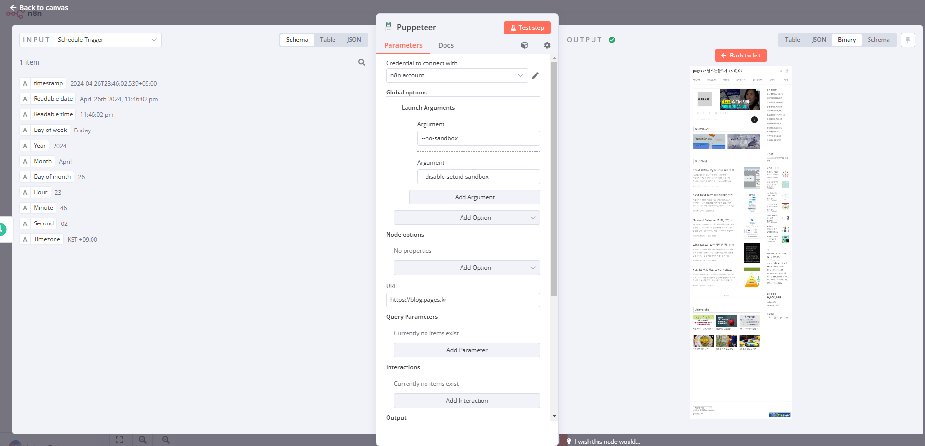 --no-sandbox --disable-setuid-sandbox - 워크플로우 저장 및 실행: 설정을 완료한 후, 워크플로우를 저장하고 실행합니다. 이제 Puppeteer는 지정한 인자를 사용하여 샌드박스 모드 없이 Chromium을 실행할 것입니다.