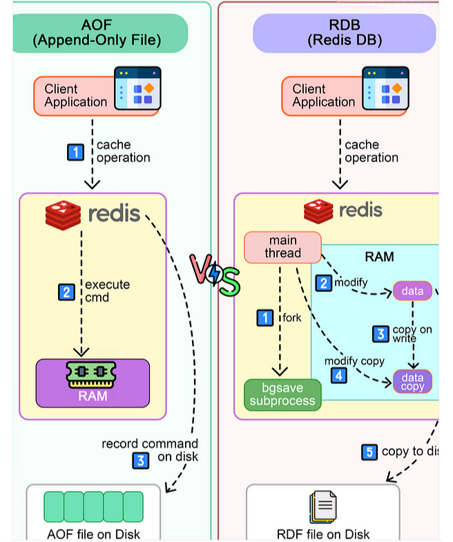 Redis는 기본적으로 메모리 내 데이터베이스이지만, 설정에 따라 디스크에 데이터를 영구적으로 저장할 수 있습니다. 이를 위해 Redis는 두 가지 주요 방법을 제공합니다: RDB (Redis Database backups) 와 AOF (Append Only File) 입니다.