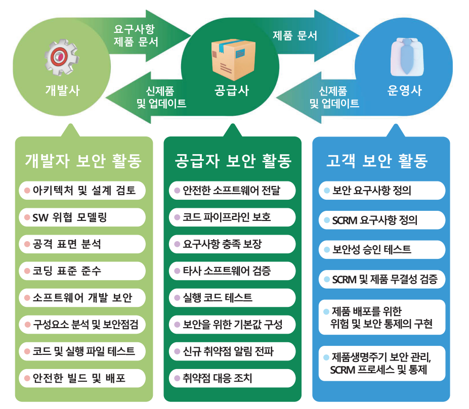 - 운영사: 보안 요구사항과 공급망 위험관리(SCRM) 요구사항을 정의하고, 그에 따라 SW 인수테스트를 진행하며, 제품 적용 및 생명주기 관리에 필요한 보안 및 공급망 위험관리 대책을 이행해야 한다.