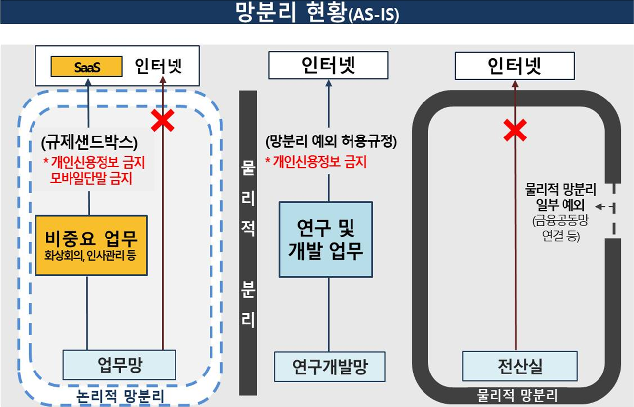 - 망분리 규제 개선 필요성: 망 분리로 인해 금융회사 및 전자금융업자의 업무 효율성이 떨어지고, 신기술 활용과 연구 개발이 어려워짐.