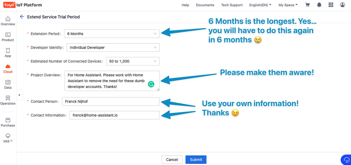 이 절차를 통해 Tuya IoT Core의 유효기간을 연장하면, IoT 서비스가 중지되는 것을 방지할 수 있습니다. 연장 신청이 승인될 때까지 대기해야 하며, 보통 몇 시간 내에 승인됩니다.