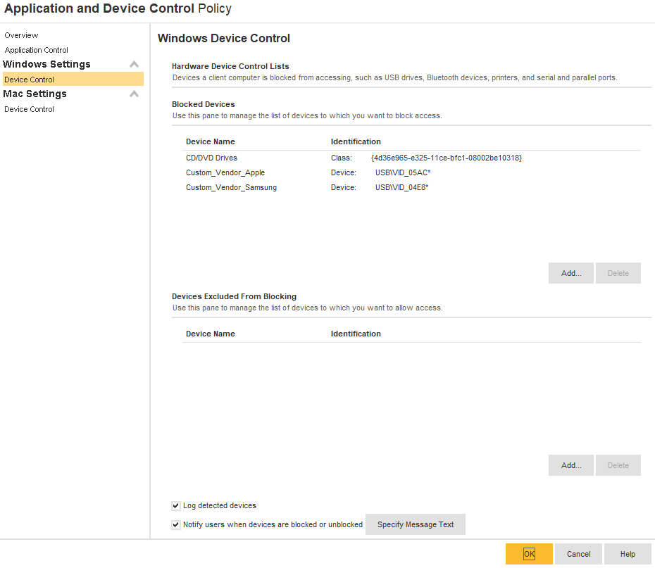 시만텍(Symantec) Endpoint Protection에서 디바이스 제어 기능을 사용하여 특정 USB 장치만을 허용하고 다른 모든 USB 장치를 차단할 수 있습니다.