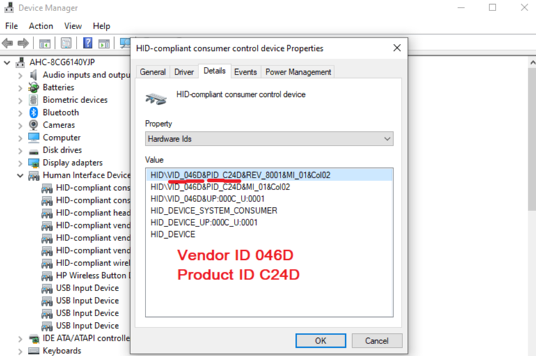 부분은 장치의 제조사를 식별하는 고유한 4자리 16진수입니다. - PID (Product ID):