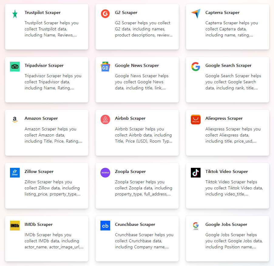 - UI 기반 스크래퍼: 몇 분 만에 어떤 웹 스크래퍼든 UI 기반 스크래퍼로 변환할 수 있습니다.