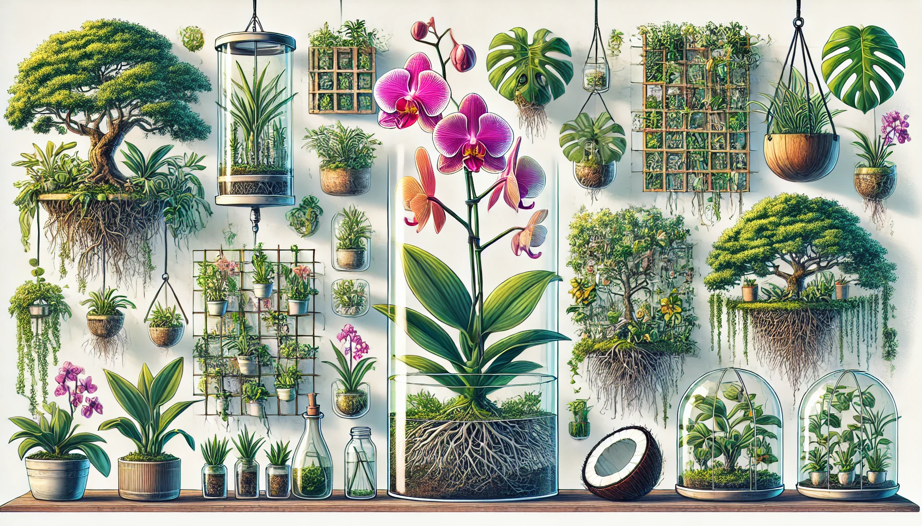 - 공중식물: 공중식물은 흙이 필요 없이 공기 중의 수분과 영양분을 흡수합니다. 작은 식물을 그물이나 유리병에 매달아 실내에 장식하면 매우 독특한 인테리어 효과를 줍니다.