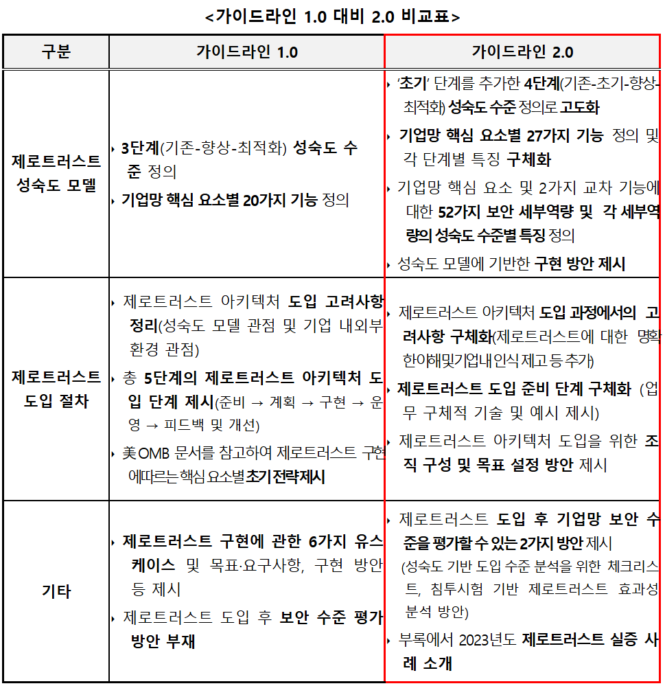 - 가이드라인 2.0은 성숙도 모델의 추상성을 극복하고 기업의 정보보호 담당자들이 제로트러스트를 실질적으로 적용·실행할 수 있도록 더 명확하고 구체적인 세부역량의 성숙도 수준별 특징을 정의