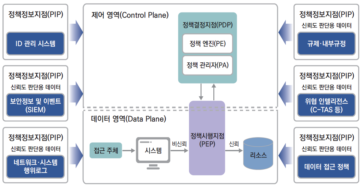 - 정책결정지점(PDP)과 정책시행지점(PEP)에서 통신을 통해, 접근 주체가 요청하는 기업 리소스에 대한 접근 허용 여부를 판단