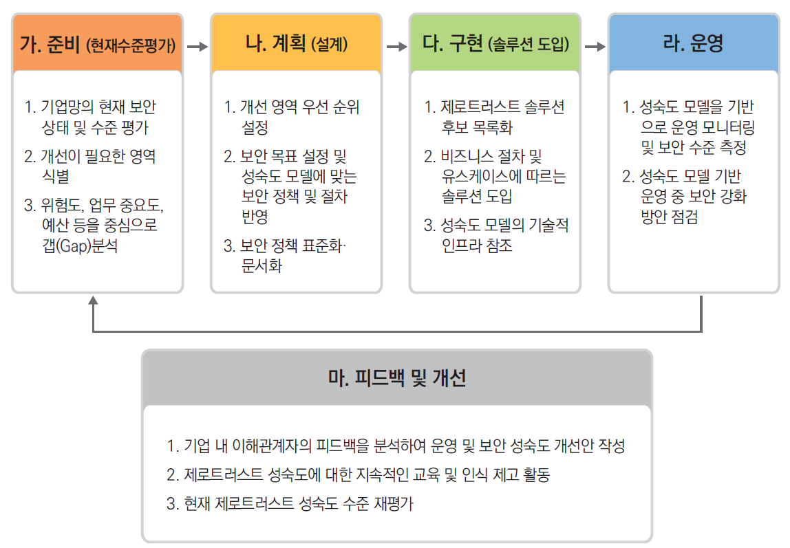 - 접근 주체, 보호 대상의 식별·정의, 현재 기업의 보안 아키텍처 분석 등을 통해 제로트러스트 구현 로드맵 수립 방안을 제시