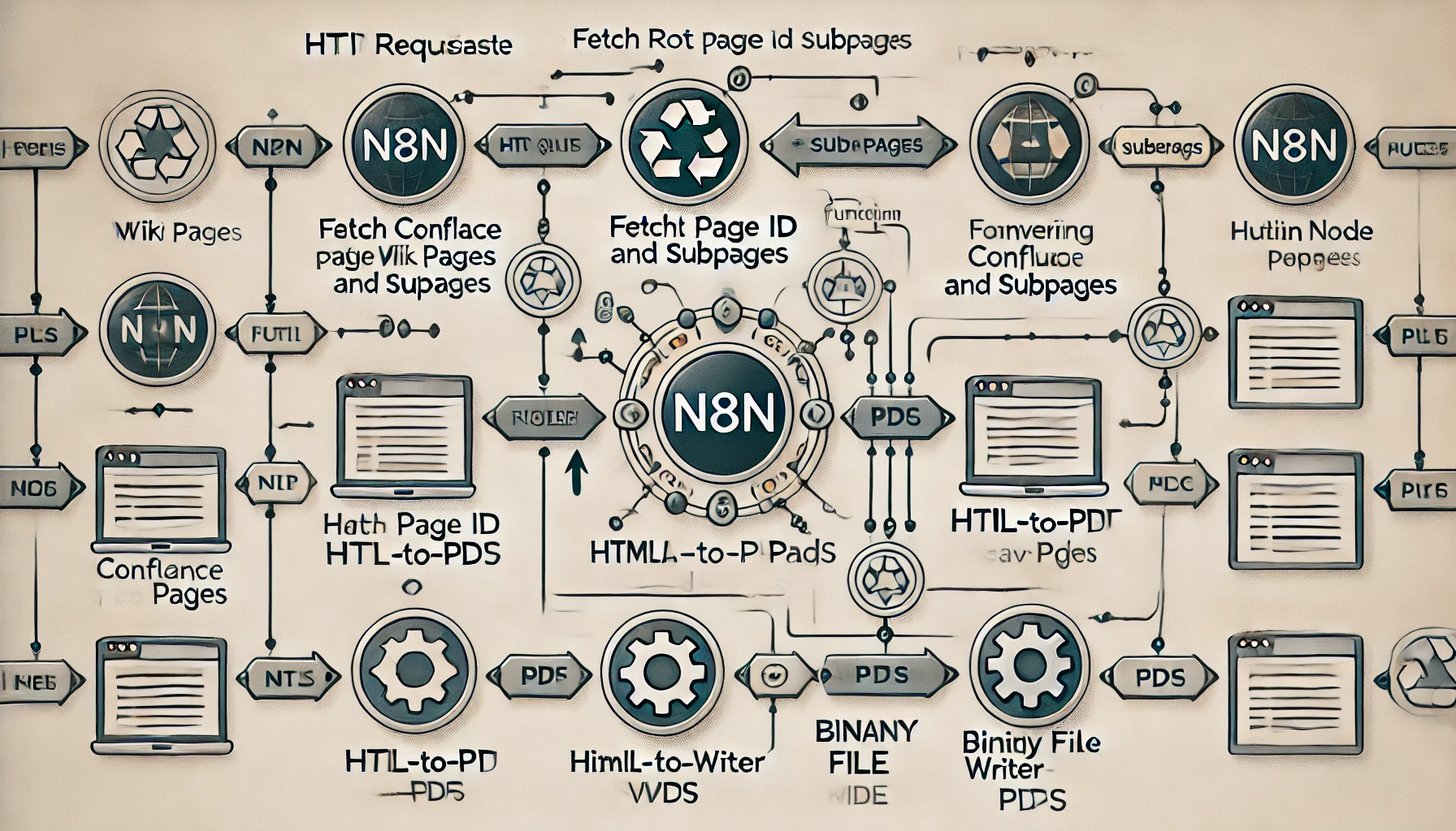 Confluence Wiki 페이지와 하위 페이지를 PDF로 저장하는 n8n 워크플로를 구성하려면 다음 단계를 따르면 됩니다. 이 과정은 Confluence API와 n8n의 HTTP Request 및 기타 노드를 사용합니다.