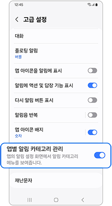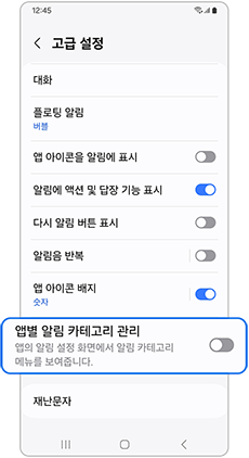 - ‘앱별 알림 카테고리 관리’ 항목을 찾아 활성화합니다.