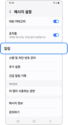 메시지 앱의 ‘알림 카테고리’ 설정이 보이지 않을 경우, 이는 ‘앱별 알림 카테고리 관리’ 설정이 비활성화되어 발생할 수 있습니다. 이 설정이 활성화되지 않으면 메시지 알림음을 개별적으로 변경할 수 없습니다.